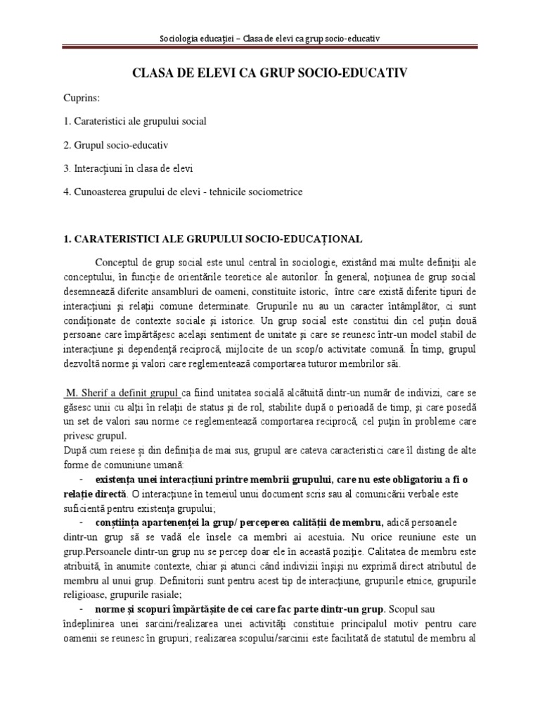 Aceasta licenta trateaza trasaturile clasei de elevi ca grup social sintalitatea mai jos poate fi vizualizat cuprinsul si un extras din document aprox. Structura clasei de elevi ca grup socio educativ este definitǎ de interrelatiile ce se constituie intre membrii ce o compun. Nevoia de afiliere de altul. Particularitatile clasei de elevi ca grup social unul dintre grupurile cele mai semnificative din viata copihllui este clasa de elevi ea satisface cel mai bine cateva dintre motivele fundamentale ale conduitei umane.