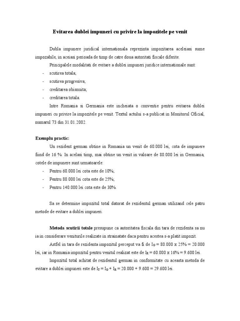 Evitarea Dublei Impuneri Cu Privire La Impozitele Pe Venit Exemplu Practic