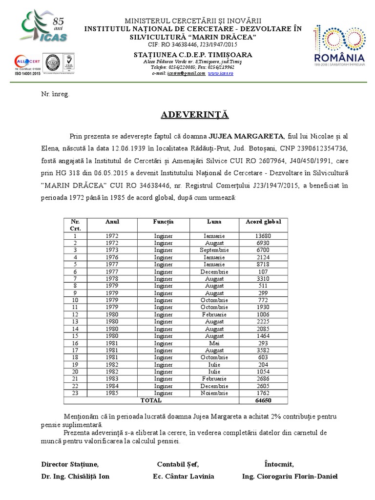 Adeverinta Vechime Jujea Margareta