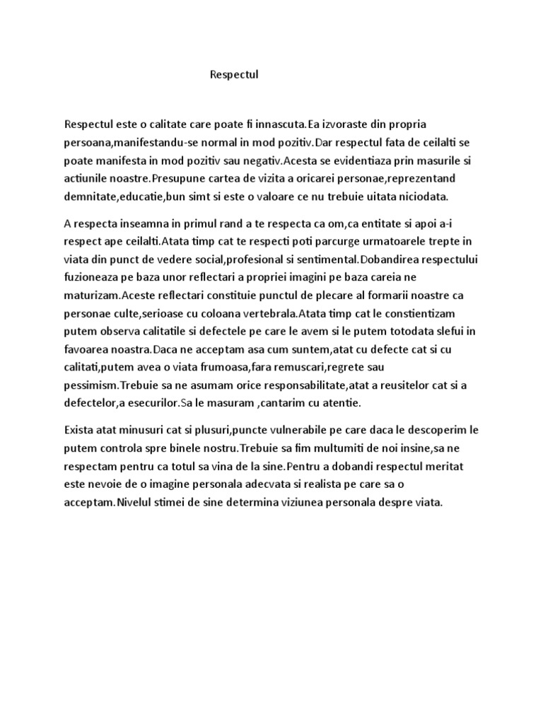 Respectul se manifesta nu numai fata de sine sau de ceilalti oameni dar si fata de comunitate. Sunt lipsiti de respect o buna parte din ei. Să asculţi pe cineva fără să îl întrerupi să iei în. Ceva ce ma apasa si nu mi da liniste.