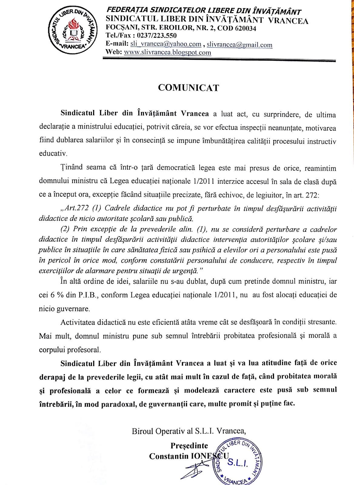 Sindicatul Liber Din Invăţămant Vrancea 2018
